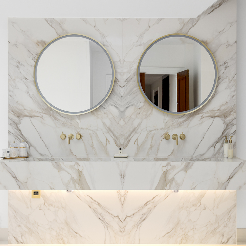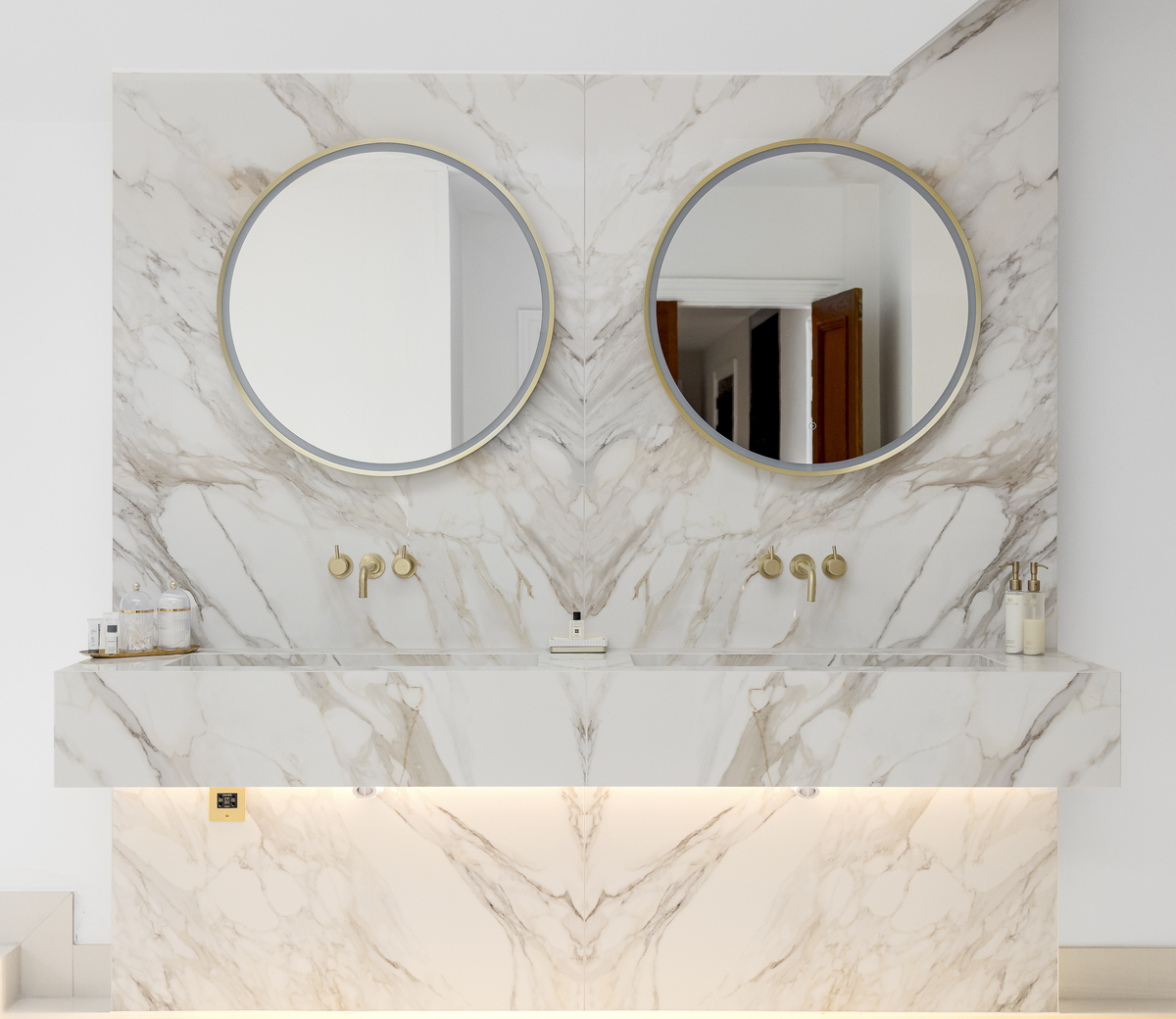Set beneath the pitched eaves of the top floor, the principal en-suite is a study in texture and restraint — large-format marble-effect porcelain from floor to ceiling, a sculptural vessel basin and warm brass detailing set against soft, integrated lighting.