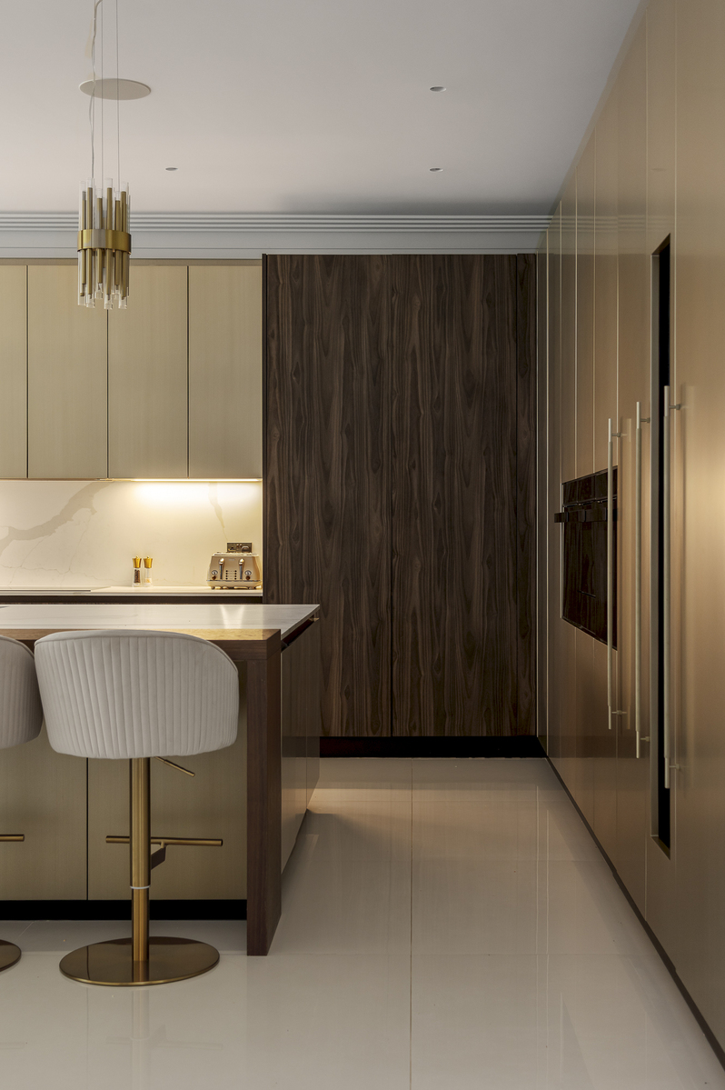 The formal living room centres around a dramatic linear fireplace beneath an integrated media wall, flanked by softly illuminated display shelving. Herringbone engineered flooring and recessed ambient lighting create a space as inviting for a quiet evening in as it is for entertaining.
