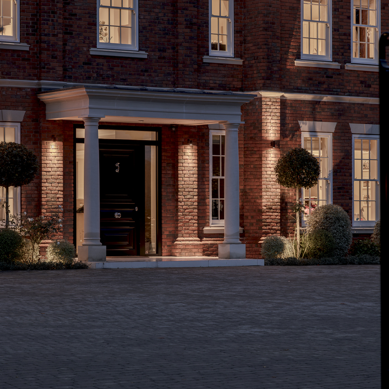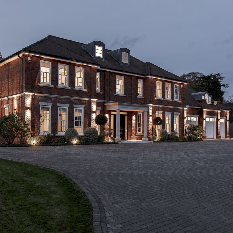A confident, symmetrical façade of handcrafted red brick, steeply pitched tiled gables and deep bay windows anchors the property within its leafy setting — understated, assured, and built to last.