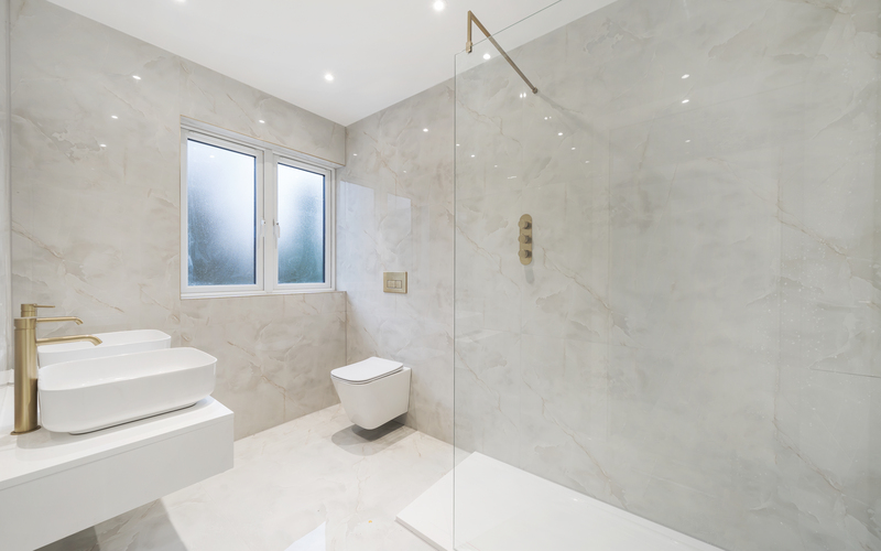 The master bathroom is tiled from floor to ceiling and has a tub with overhead rainfall shower and an additional freehand shower attachment. This room has a larger vanity unit plus a heated towel rail which is great for warming your towels on after use and has been stylishly designed in keeping with the theme of these houses.